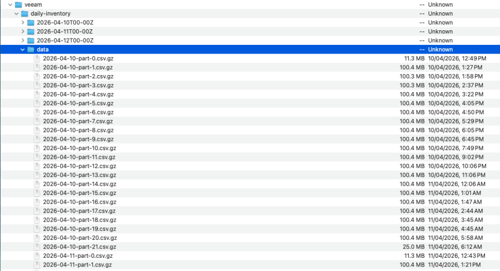- The inventory is written to 2nd bucket (veeam-inv) in the same account